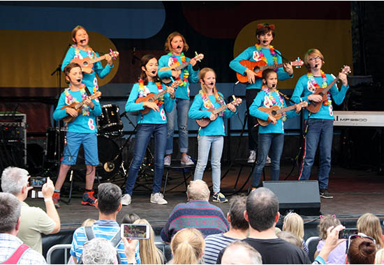 Auf einer Open-Air-Bühne am Kinderspielplatz traten viele bekannte Kinder-Tanzgruppen auf – als besonderer Programmpunkt spielten und sangen die hüpfenden Flöhe. Besondere, musikalische Verstärkung: Pete op der Quetsch und Boris mit seiner Riesenukulele, herzlichen Dank.
